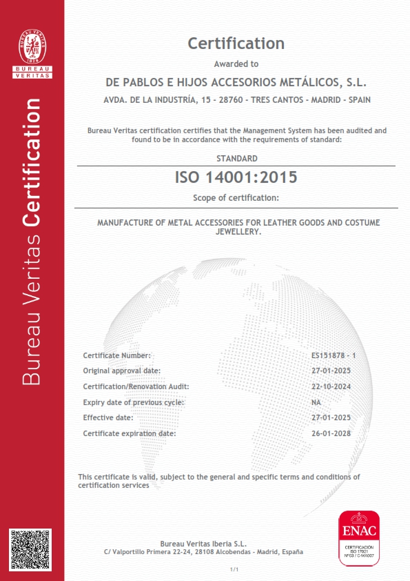 DE PABLOS E HIJOS ACCESORIOS METÁLICOS, S.L. es una empresa dedicada a las actividades de “Fabricación de bisutería y accesorios metálicos para la industria de la marroquinería”.